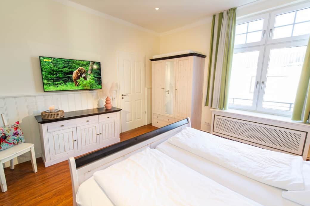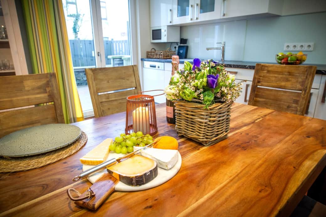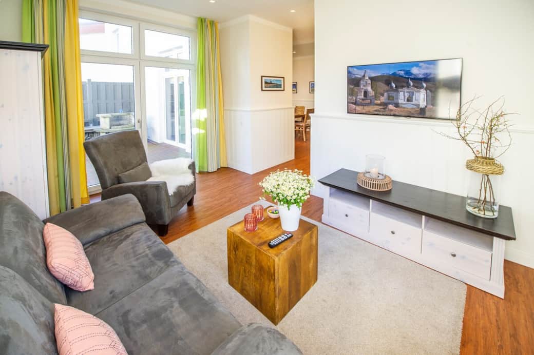Die großzügige Maisonettewohnung (95 qm) bietet Platz für bis zu 4 Personen. Sie verfügt über 2 Schlafzimmer, 2 moderne Bäder, eine Sauna und eine voll ausgestattete Küche und eine große Terrasse mit Grill. Wohnbereich im Erdgeschoss, Schlafräume oben. Hochwertige Ausstattung, WLAN, TV, ideal für Familien – auch bei schlechtem Wetter.