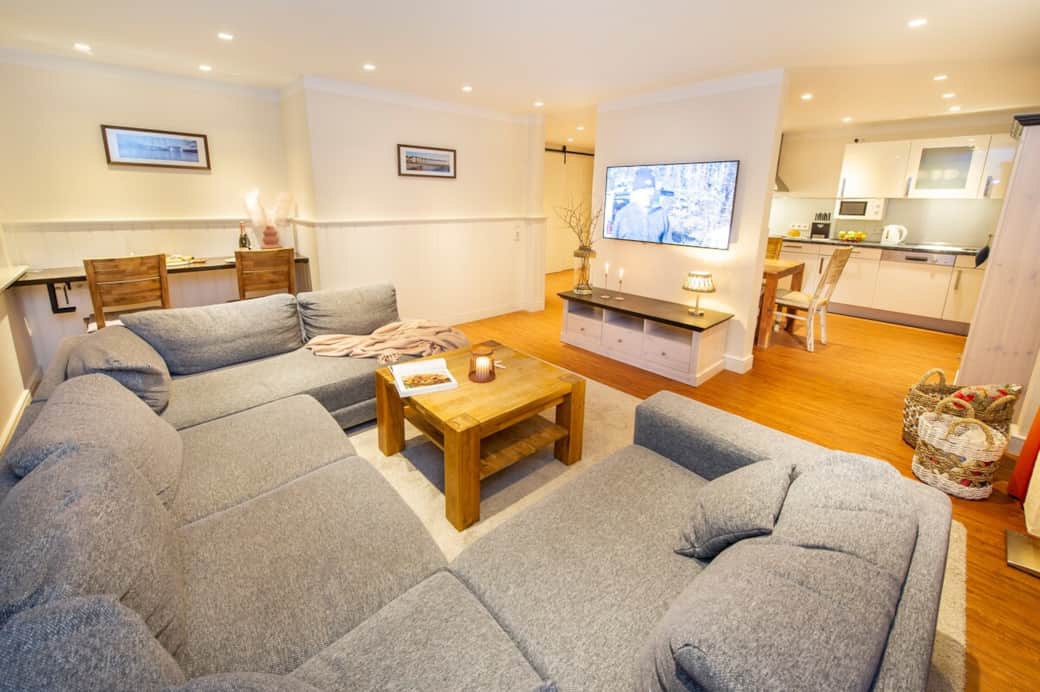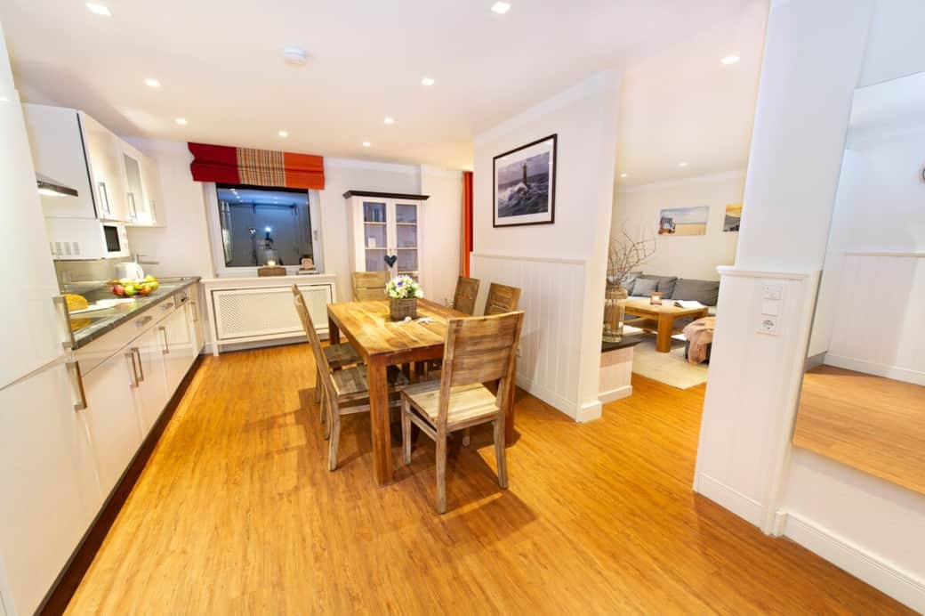 Die Ferienwohnung Nr. 5 im Haus Feuerstein bietet auf 101 qm Platz für bis zu sechs Personen. Im Erdgeschoss erwarten Sie ein großzügiger Wohn-/Essbereich mit voll ausgestatteter Küche sowie ein modernes Bad. Waschmaschine und Trockner stehen zur Verfügung. Die große Nordterrasse mit Grill und Sonnenliegen lädt zum Entspannen ein. Im Obergeschoss befinden sich drei Schlafzimmer und ein weiteres Bad.